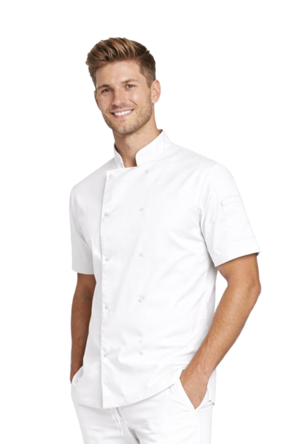 Bílá kuchařská blůza na knoflíky je moderním gastronomickým oblečením navrženým pro profesionály pracující v dynamickém kuchyňském prostředí. Model kombinuje funkčnost, vysoký komfort nošení a estetický, elegantní vzhled, což ho činí ideálním pro restaurace, hotely, cateringové společnosti a cukrárny.