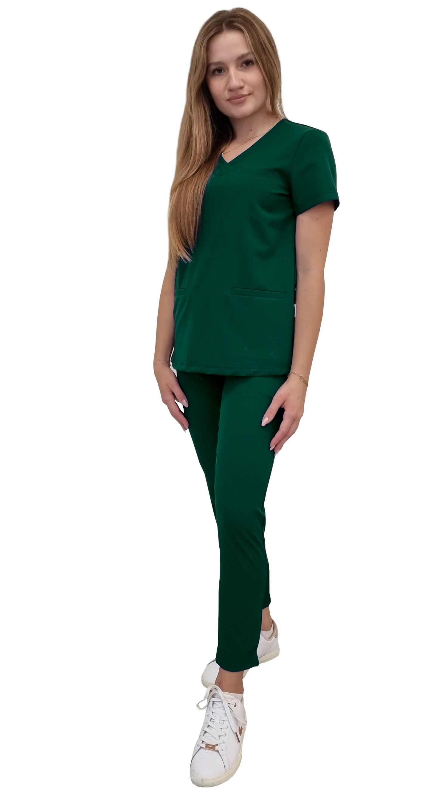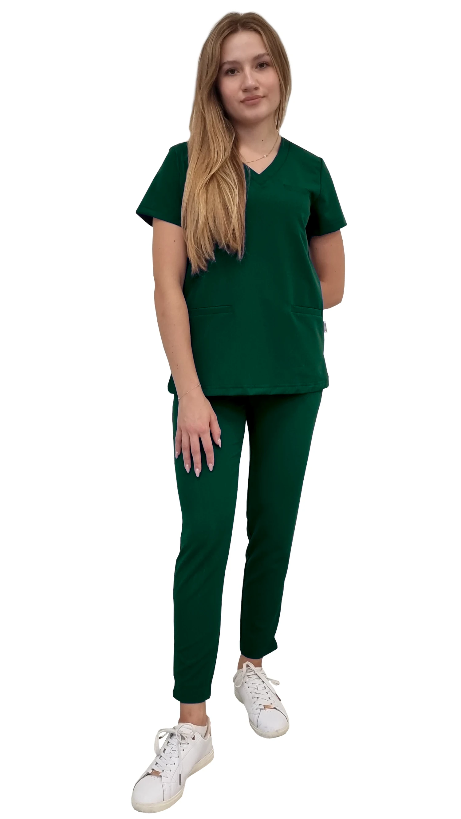 Lékařská uniforma pro ženy BASIC PREMIUM v barvě zelené láhve je profesionální set, který kombinuje moderní styl, pohodlí a vysokou kvalitu látky. Součástí setu je lékařská blůza BASIC PREMIUM a lékařské kalhoty BASIC PREMIUM, které dohromady tvoří spolehlivý scrub pro práci v medicínském a beauty sektoru.