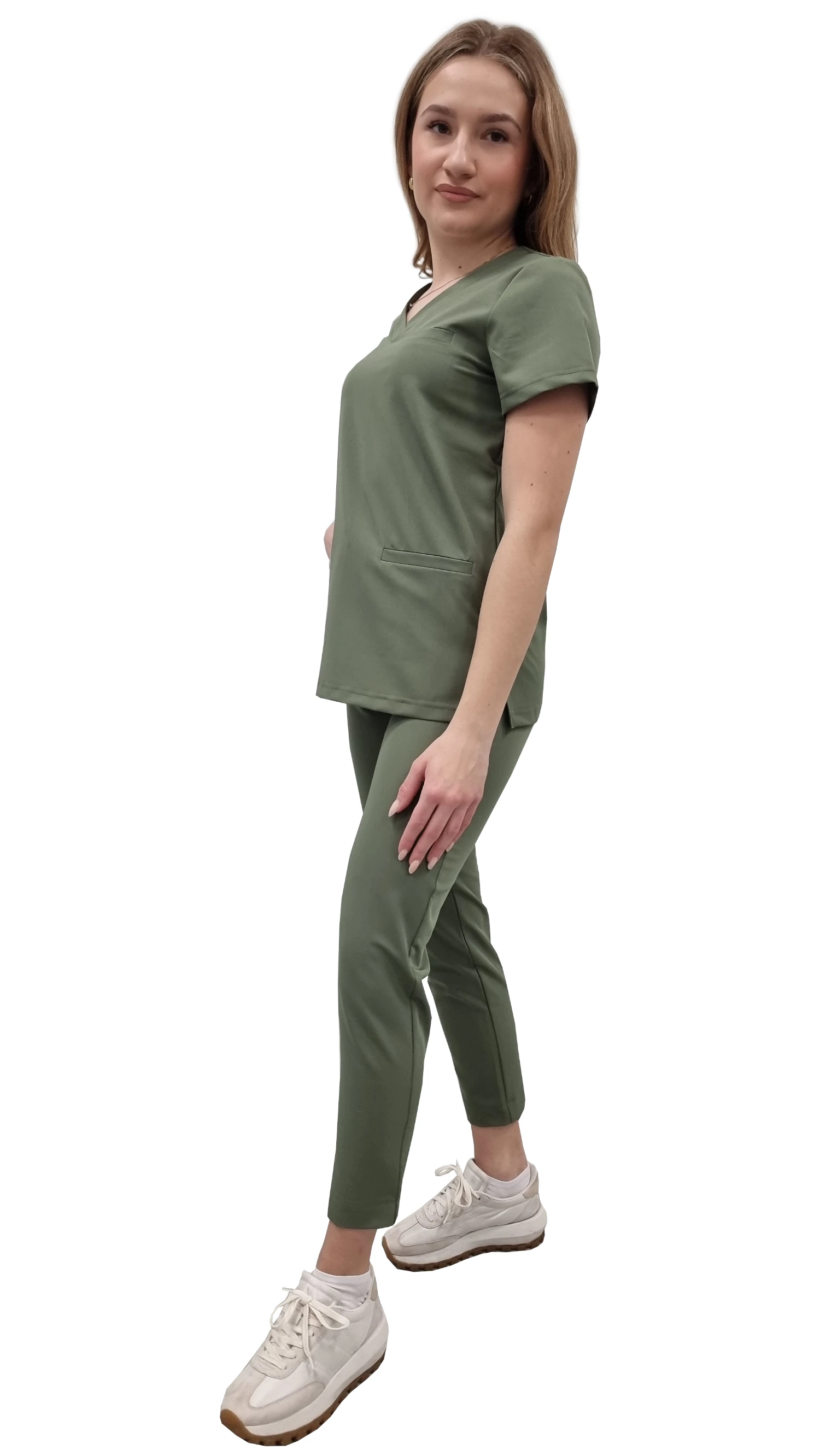 Dámský lékařský uniform BASIC PREMIUM v olivové barvě je profesionální sada, která spojuje moderní styl, pohodlí a vysokou kvalitu látky. Sada obsahuje lékařskou blůzu BASIC PREMIUM a lékařské kalhoty BASIC PREMIUM, které společně vytvářejí spolehlivé scrubs pro práci v oboru zdravotnictví a krásy.