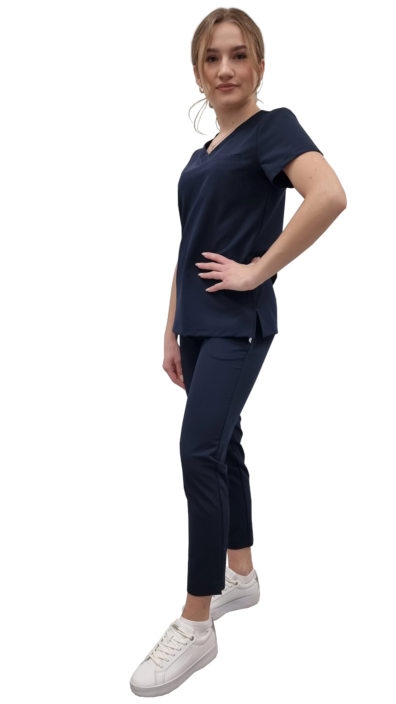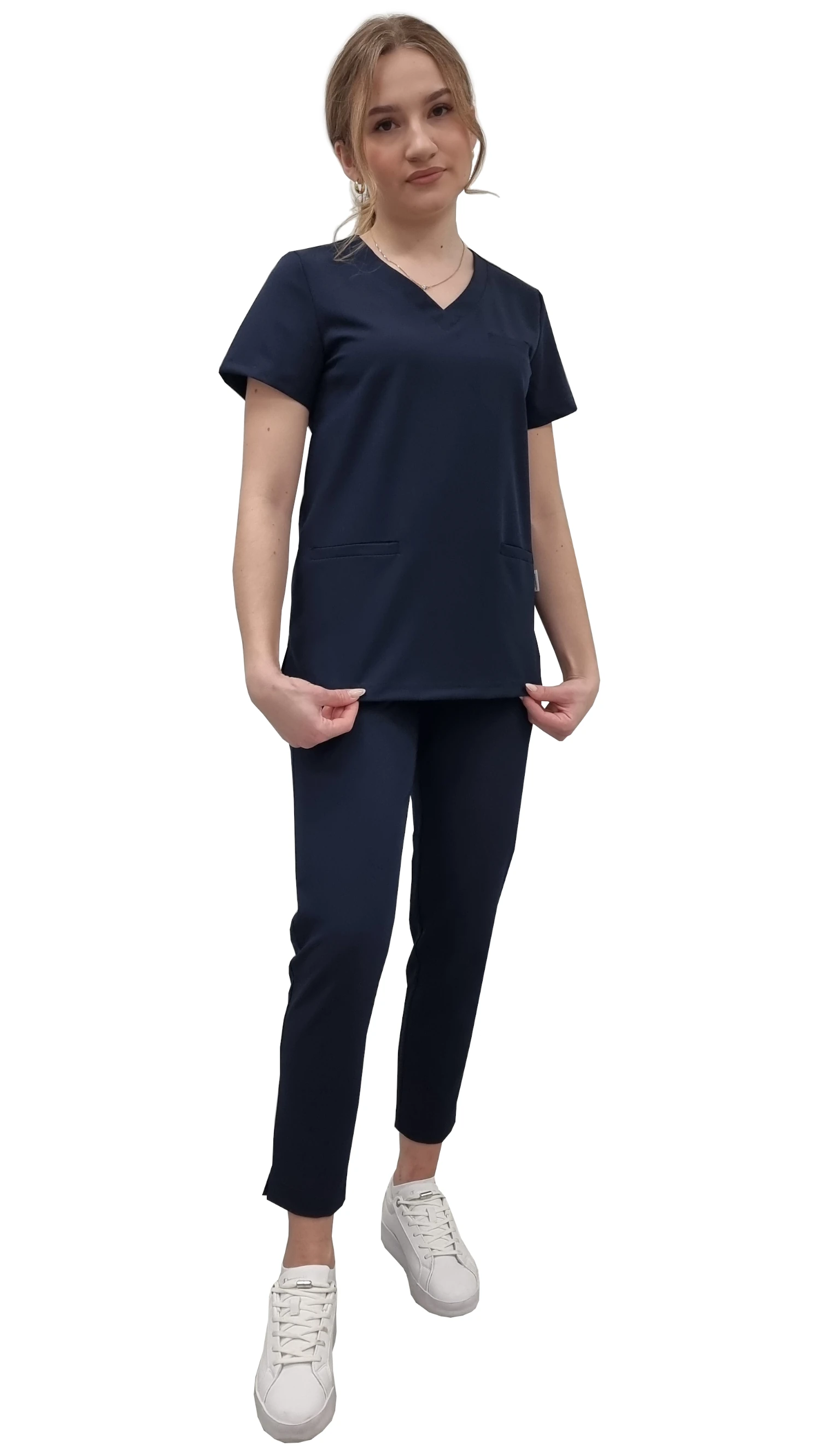 Zdravotnická uniforma pro ženy BASIC PREMIUM v barvě tmavě modrá je profesionální sada spojující moderní styl, pohodlí a vysokou kvalitu látky. Součástí setu je zdravotnická košile BASIC PREMIUM a zdravotnické kalhoty BASIC PREMIUM, které tvoří spolehlivé scrub sady pro práci v medicíně a kosmetice.