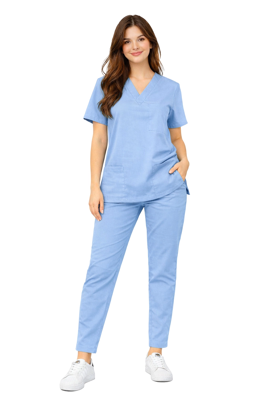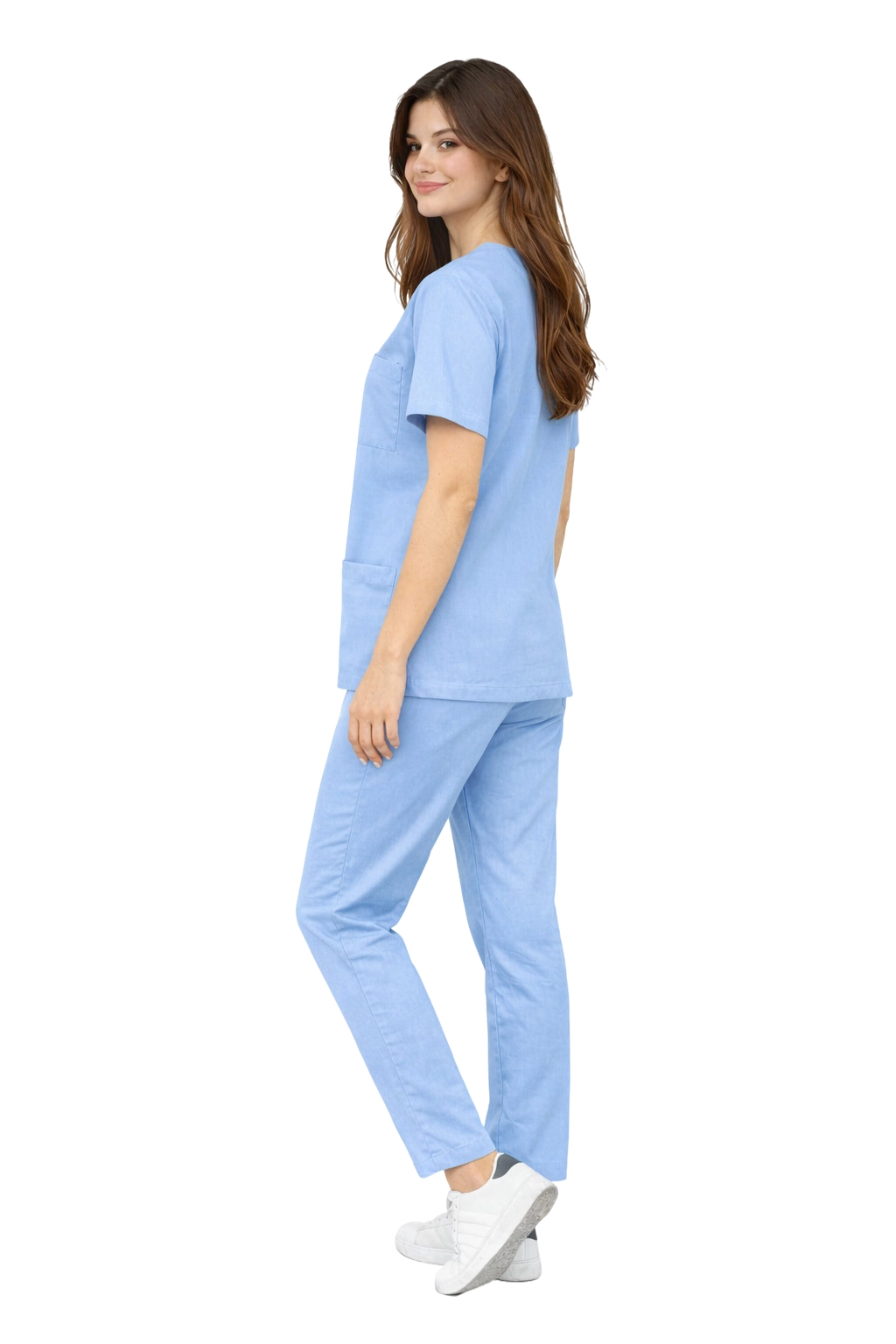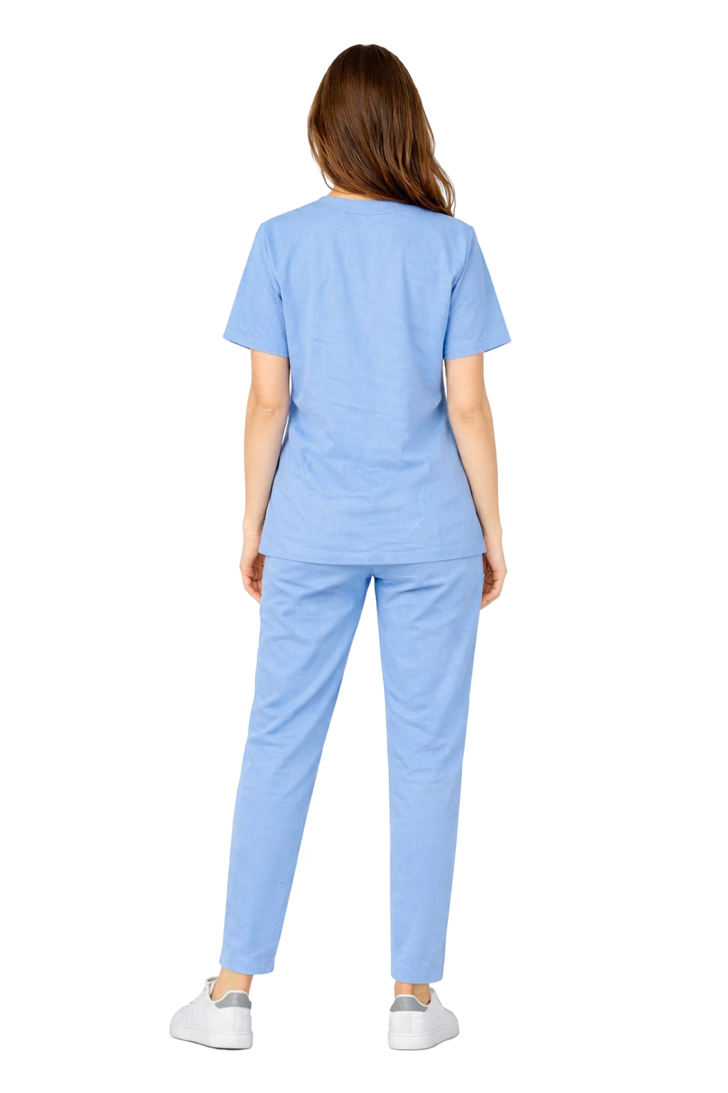 Dámský lékařský set 100% bavlny v modré barvě je klasická a pohodlná sada navržená pro ženy pracující ve zdravotnickém sektoru – lékařky, sestry, rehabilitační terapeutky a fyzioterapeutky. Přírodní tkanina o gramáži 155 g/m² zajišťuje vysoký komfort nošení po celý den a zároveň umožňuje kůži dýchat. Materiál zachovává intenzivní barvu a stabilní velikost i po mnoha praních.