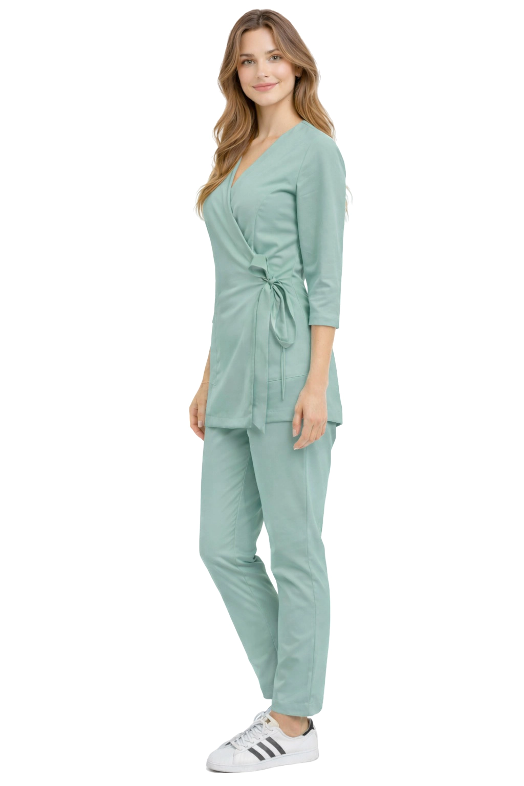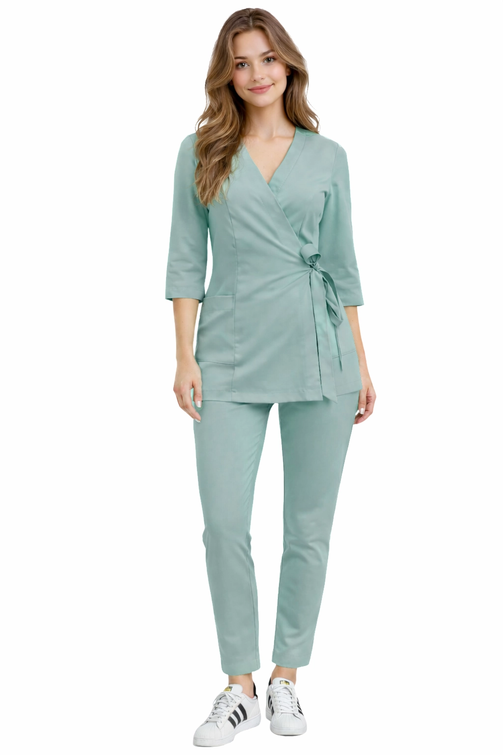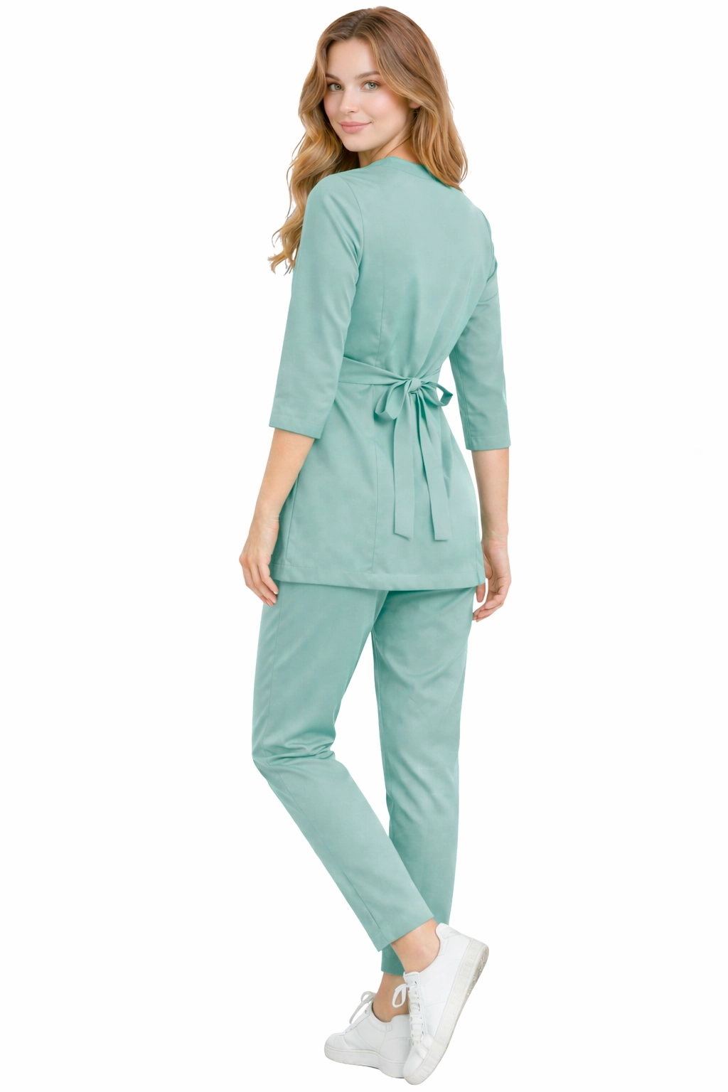 Lékařská tunika s přehozem byla navržena tak, aby dokonale fitovala postavě. Vázání v pase umožňuje individuální úpravu a zdůraznění ženských křivek při zachování pohodlí nošení.