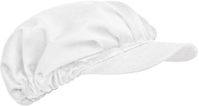 Bílý kuchařský klobouk s kšiltem je praktickým prvkem pracovních oděvů určených pro práci v gastronomii, pekárnách, cukrárnách a potravinářských podnicích. Model typu gatsby kombinuje estetický vzhled s pohodlím každodenního užívání. Díky pružnému obvodu se čepice dobře přizpůsobuje hlavě a pomáhá udržovat vlasy pod kontrolou během práce.