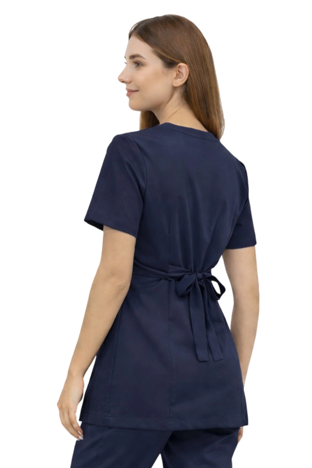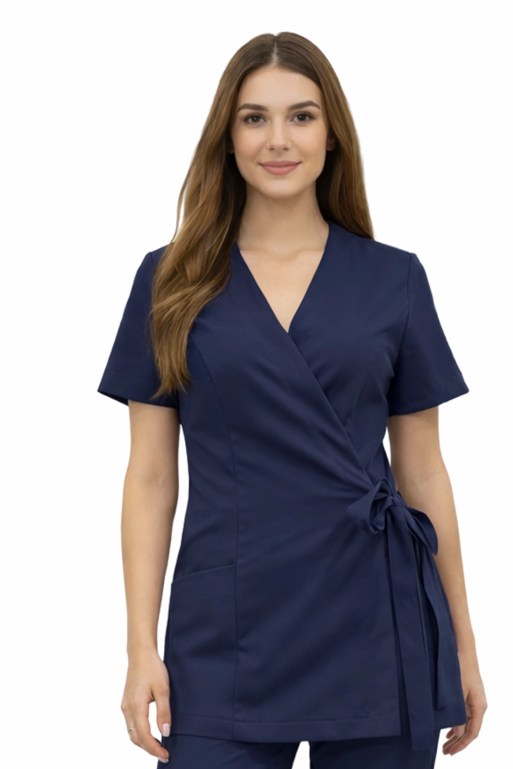 Výstřih ve tvaru písmene V opticky prodlužuje krk a dodává lehkost celkovému stylu. Jedná se o kombinaci estetiky a pohodlí, která funguje jak při práci s klientem, tak během intenzivních pracovních povinností.