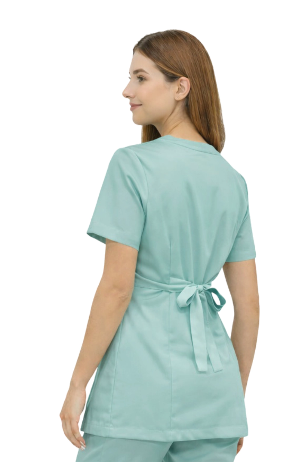 Výstřih ve tvaru písmene V opticky štíhlí krk a dodává celkovému stylu lehkost. Je to kombinace estetiky a pohodlí, která funguje jak při práci s klientem, tak při intenzivních povinnostech.
