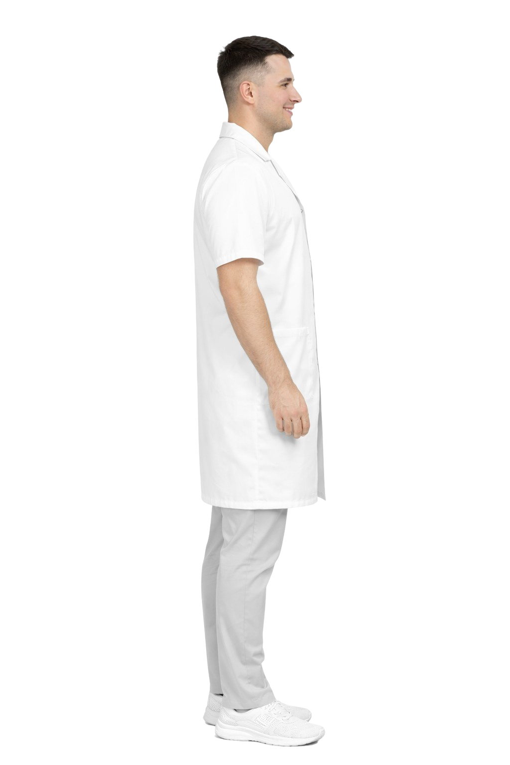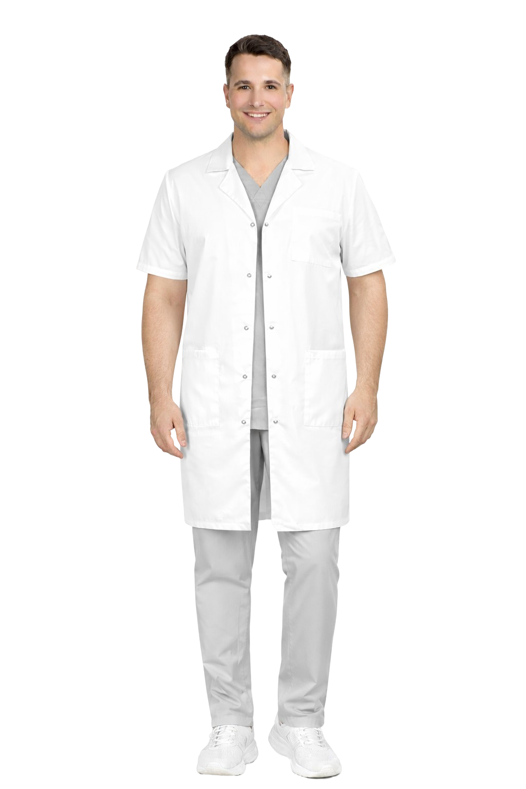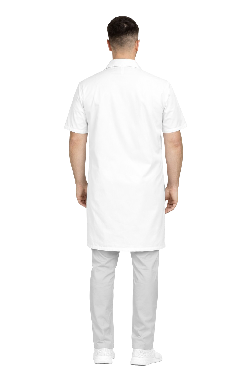 Mužský lékařský plášť - sněhobílý, krátký rukáv PREMIUM - 195 - 205 g/m²