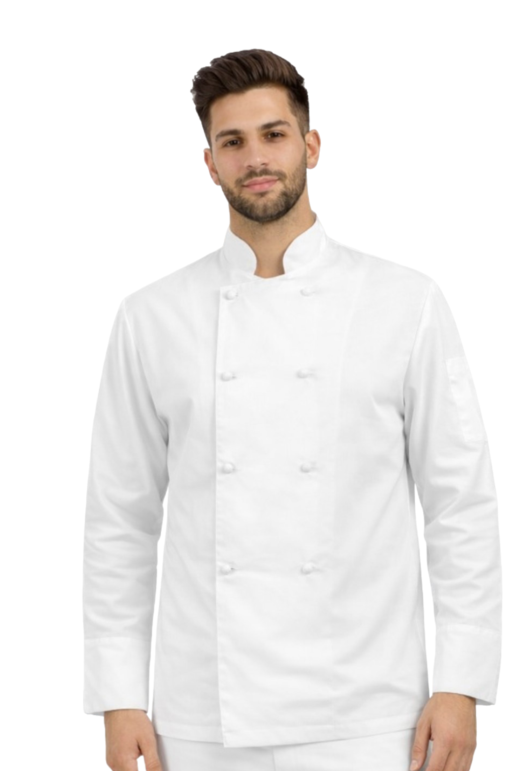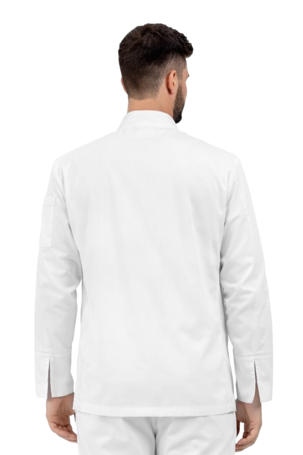 Bílá kuchařská blůza - pracovní plášť pro mužského šéfkuchaře s dlouhými rukávy