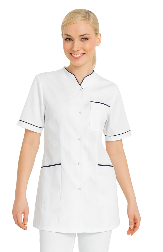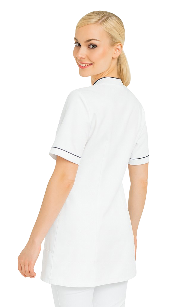 Bílý dámský kosmetický lékařský žaket s námořnickým lemem.